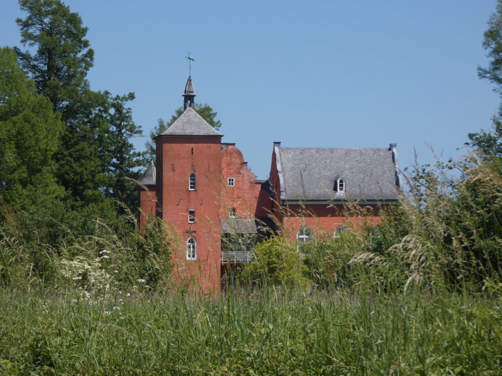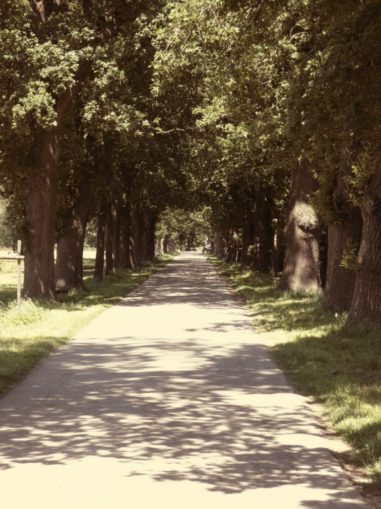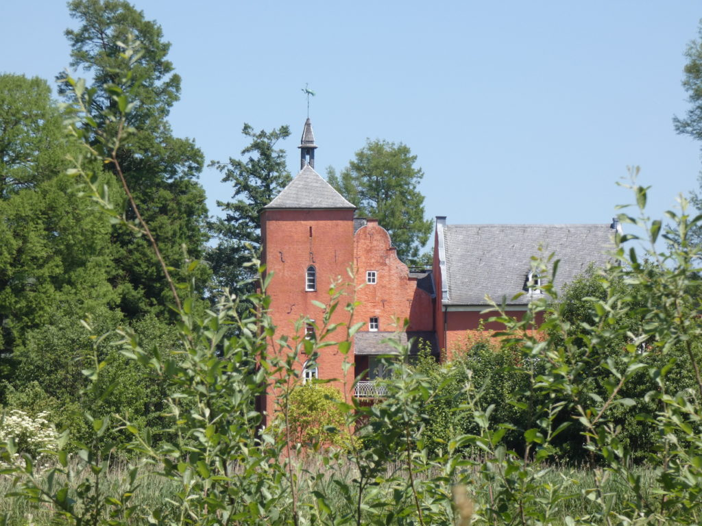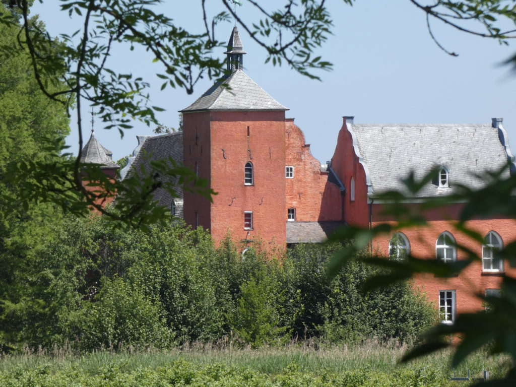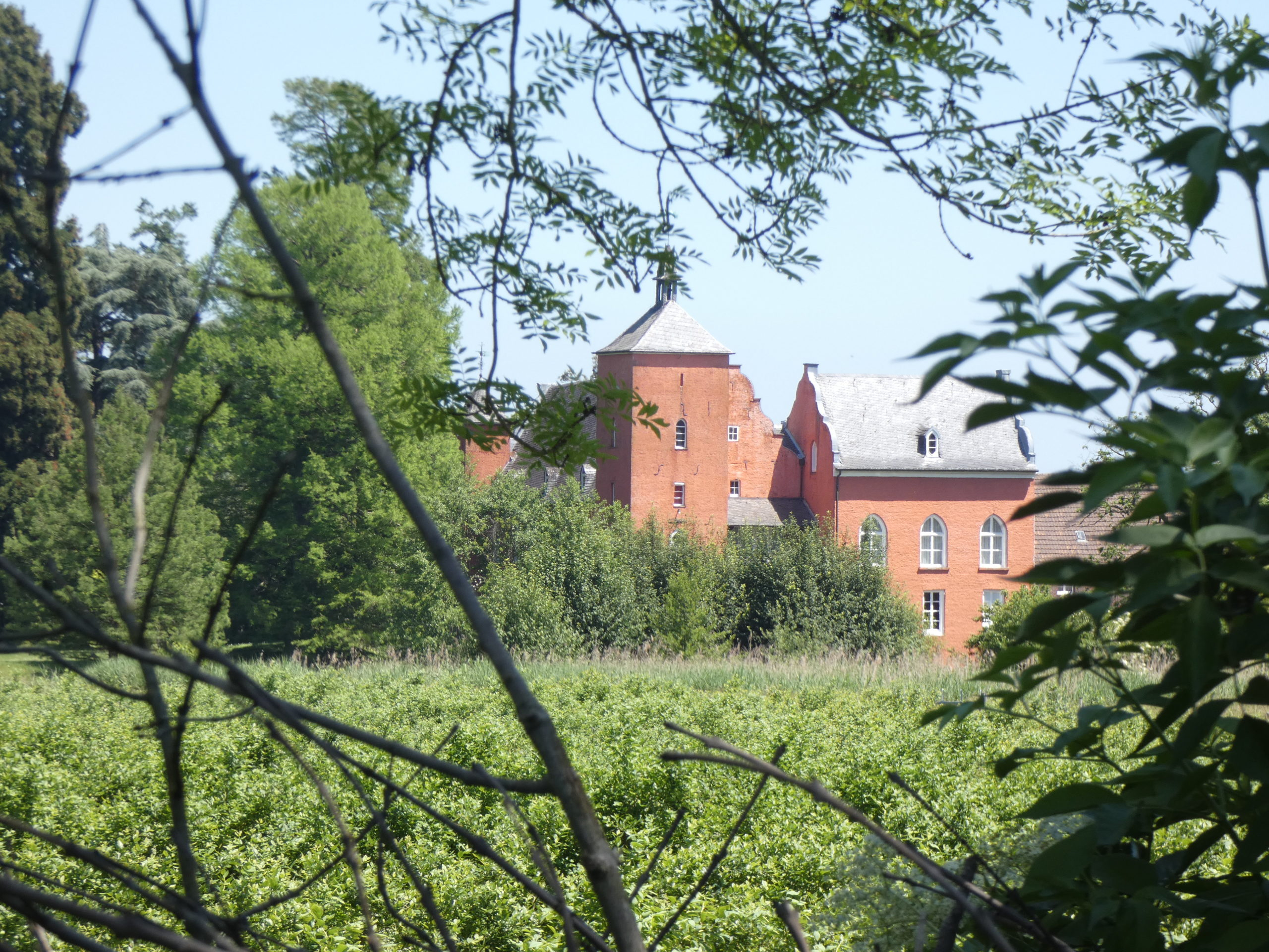 Hinter einer Wegschranke halten wir uns an der Gabelung ebenso links wie am nächsten T-Abzweig. Vor uns erhebt sich das erstmals im Jahre 1406 erwähnte Wasserschloss Bloemersheim. Eine Brücke bietet uns eine schöne Aussicht auf den Schlossweiher. Unsere Route verläuft im Rechtsbogen und schwenkt sowohl an der Schlosszufahrt als auch am T-Abzweig danach links ab. Dort, wo rechter Hand die Obstplantagen Bloemersheim zu sehen sind, nimmt uns eine Allee mit beeindruckend alten Eichen auf. Wir überqueren die Hochkamerstraße und folgen geradeaus dem A3 durch einen lichten Wald. An einer Kreuzung biegen wir links ab, ignorieren einen rechten Abzweig und bleiben an der nächsten Kreuzung rechts der Wandermarkierung treu. Nun geht es eine ganze Weile geradeaus durch Wald und Wiesen zum von Bäumen gesäumten Heisterweg. Wir halten uns links und verlassen wenig später die Straße in einer Linkskurve. Geradeaus leitet uns der A3 am Waldrand entlang zurück zum Parkplatz.